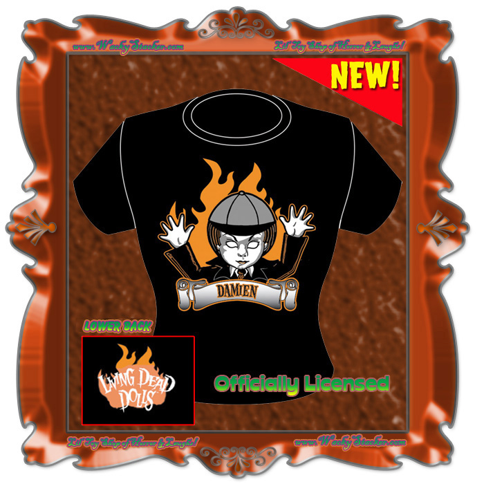 From the original Living Dead Dolls Series 1 comes Damien, ablaze in orange on this fitted black ladies' tee. Two sided, with a small logo print on the lower back, on a 100% cotton American Apparel (made in USA!) babydoll tee.