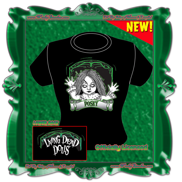 From the original Living Dead Dolls Series 1 comes Posey, rising from her glowing green grave on this fitted black ladies' tee. Two sided, with a small logo print on the lower back, on a 100% cotton American Apparel (made in USA!) babydoll tee.