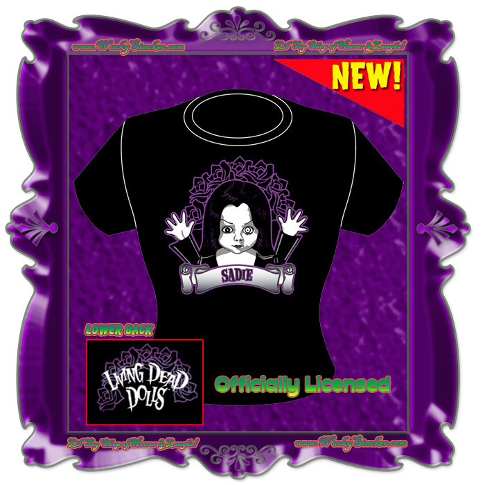 From the original Living Dead Dolls Series 1 comes Sadie, backed by purple funeral flowers on this fitted black ladies' tee. Two sided, with a small logo print on the lower back, on a 100% cotton American Apparel (made in USA!) babydoll tee.