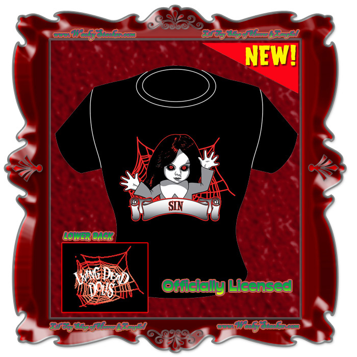 From the original Living Dead Dolls Series 1 comes Sin, fiery red eyes ablaze on this fitted black ladies' tee. Two sided, with a small logo print on the lower back, on a 100% cotton American Apparel (made in USA!) babydoll tee.