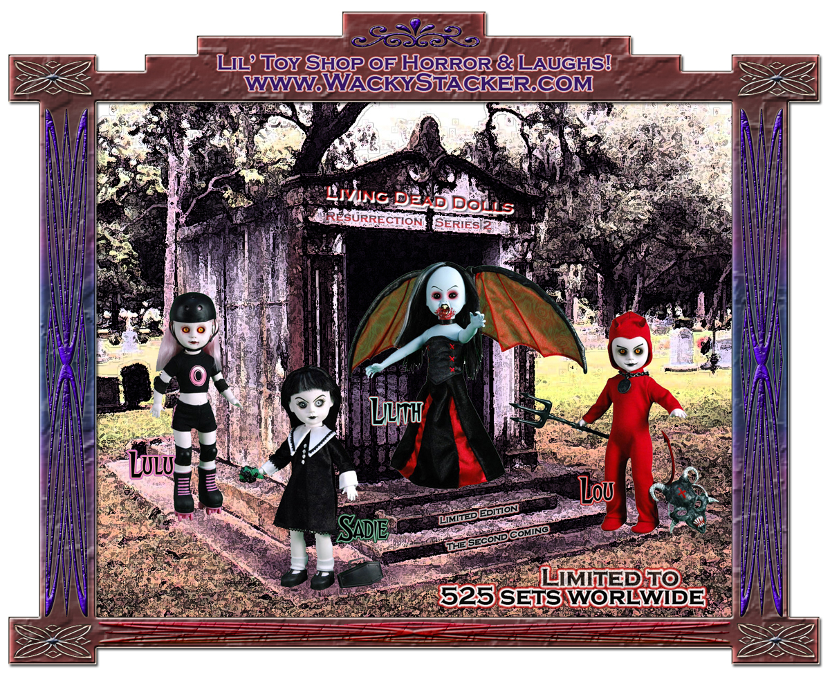 Living Dead Dolls Resurrection Series 2 celebrates the second coming of the most popular characters with new twisted designs from their creators. The phenomenon that has become "Living Dead Dolls" strikes again with these "laid to rest" characters from the 10" doll line. The resurrection of Sadie, Lou Sapphire, Lilith, and Lulu. Featuring macabre new accessories and darkly deviant designs, these lethally deviated dolls are sure to raise some hell. Living Dead Dolls Resurrection: The Second Coming is a limited edition of 525 sets worldwide. All four dolls have new glass-like eyes that will burn into your soul. All dolls include their trademark death certificates, intricately detailed outfits and are hand painted.