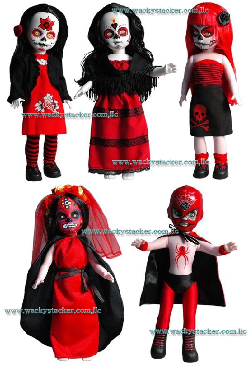 Living Dead DollsSeries 20 VariantsDay Of The DeadIn the spirit of Halloween, Mezco's latest set of Living Dead Dolls pays tribute to the skeleton filled holiday known as The Day of the Dead or El Día de los Muertos. The variant series features intricate skull designs and exclusive crimson and black elaborate costumes, depicting traditional imagery with a Living Dead Dolls twist. Each doll comes in a signature coffin package with death certificate. This set is extremely limitedEach day of the dead doll is 10", comes complete with real cloth clothing & shipsin its own coffinwith originaldeath certificateand accessoriesSet of 5 dollsBONUS FREE SHIPPING(SHIPPING SAVINGS value is approx $50)within lower 48 United StatesNEAR MINT/SEALED: $429.991 SET AVAILABLENear Mint w/ Bargain Basement Camillasealed from factory sold as-is